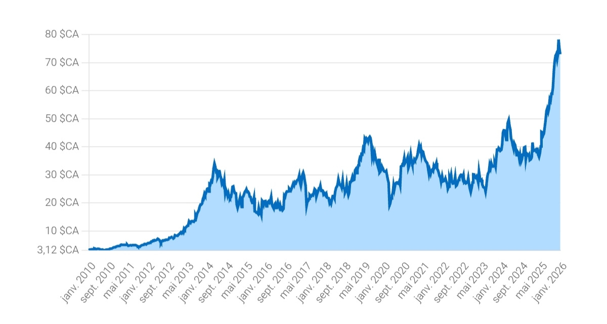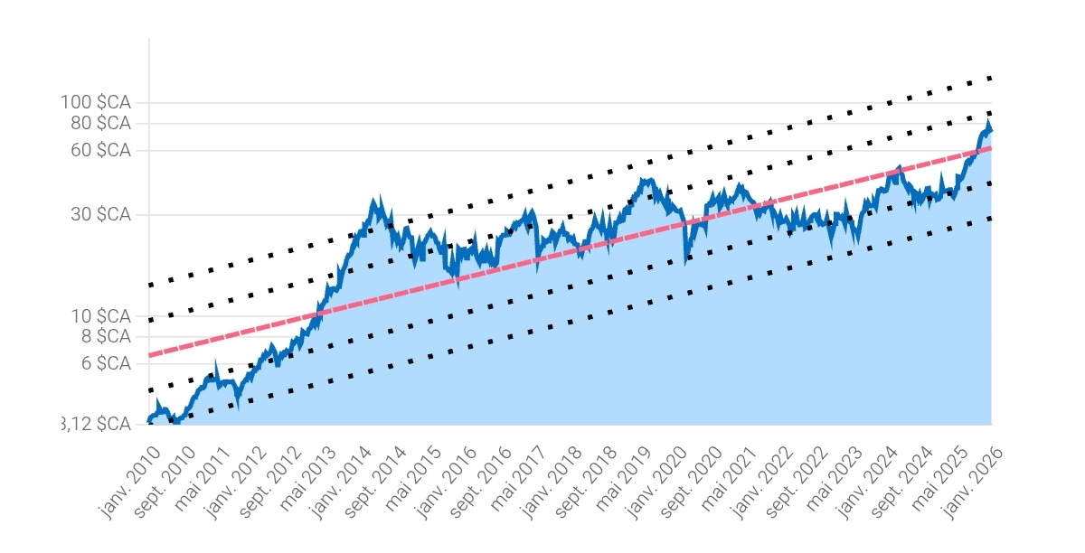 Après avoir réalisé une très belle performance boursière à l’occasion de l'année 2025 (+100%), le cours de Badger Infrastructure Solutions se situe désormais très proche de ses plus hauts historiques. Sur un plus long terme des pics / corrections régulier(e)s sont observables.